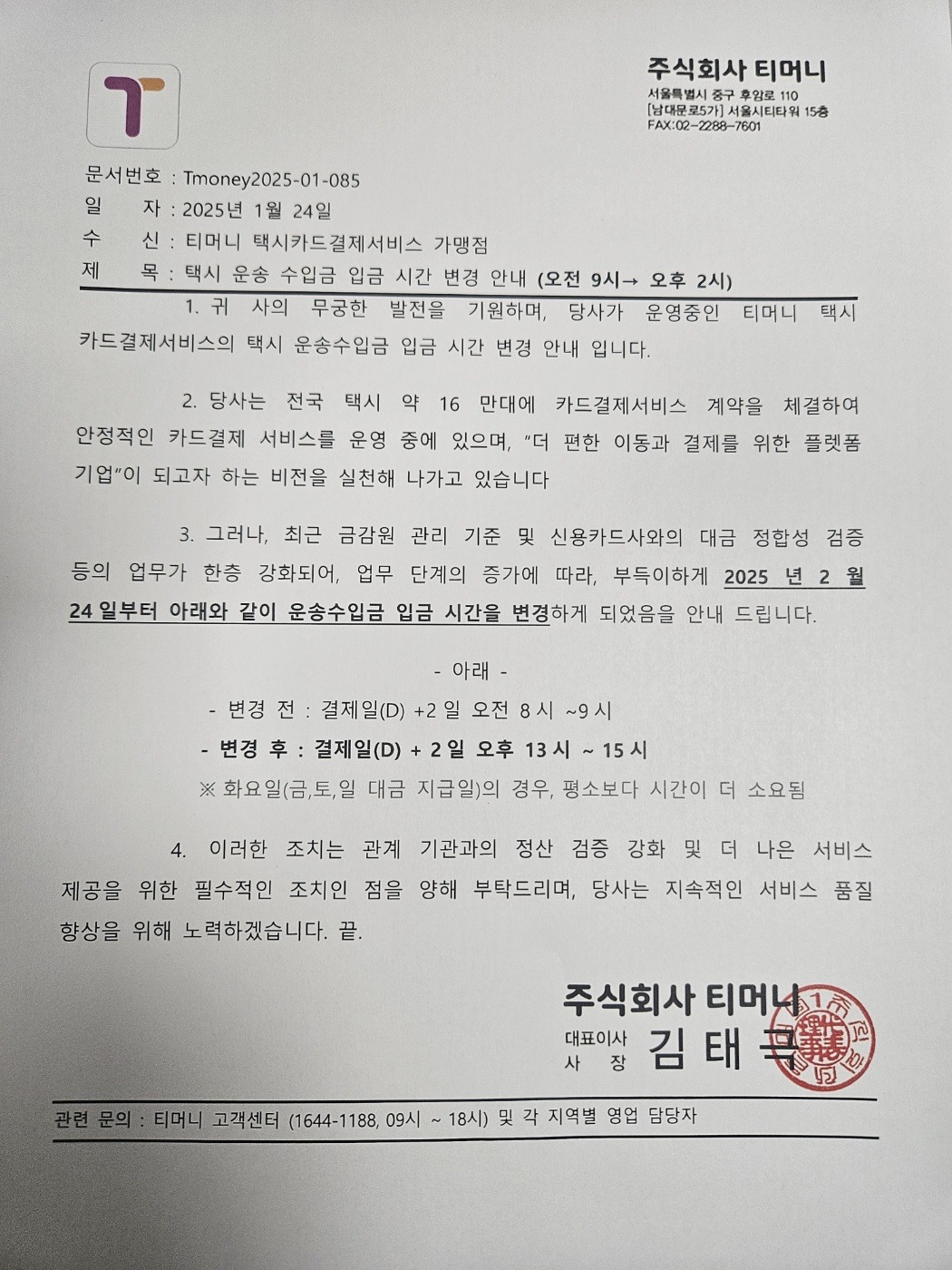 티머니 택시카드 결재서비스변경관련