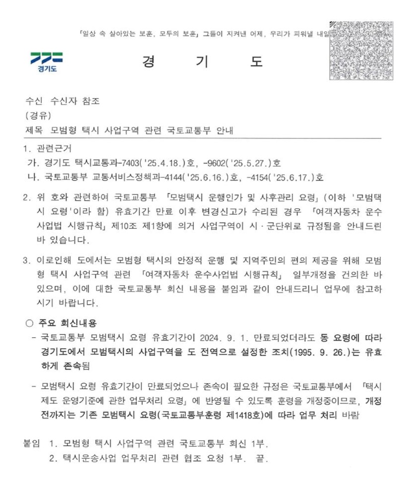 모범형택시 사업구역 관련안내