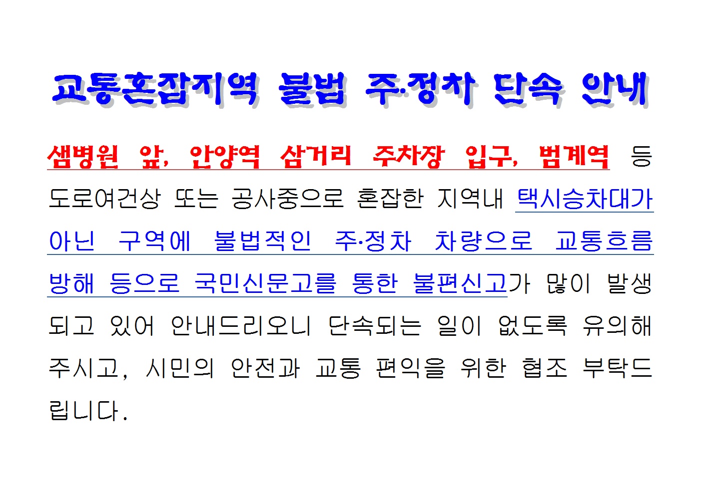 교통혼잡지역 불법 주.정차 단속안내