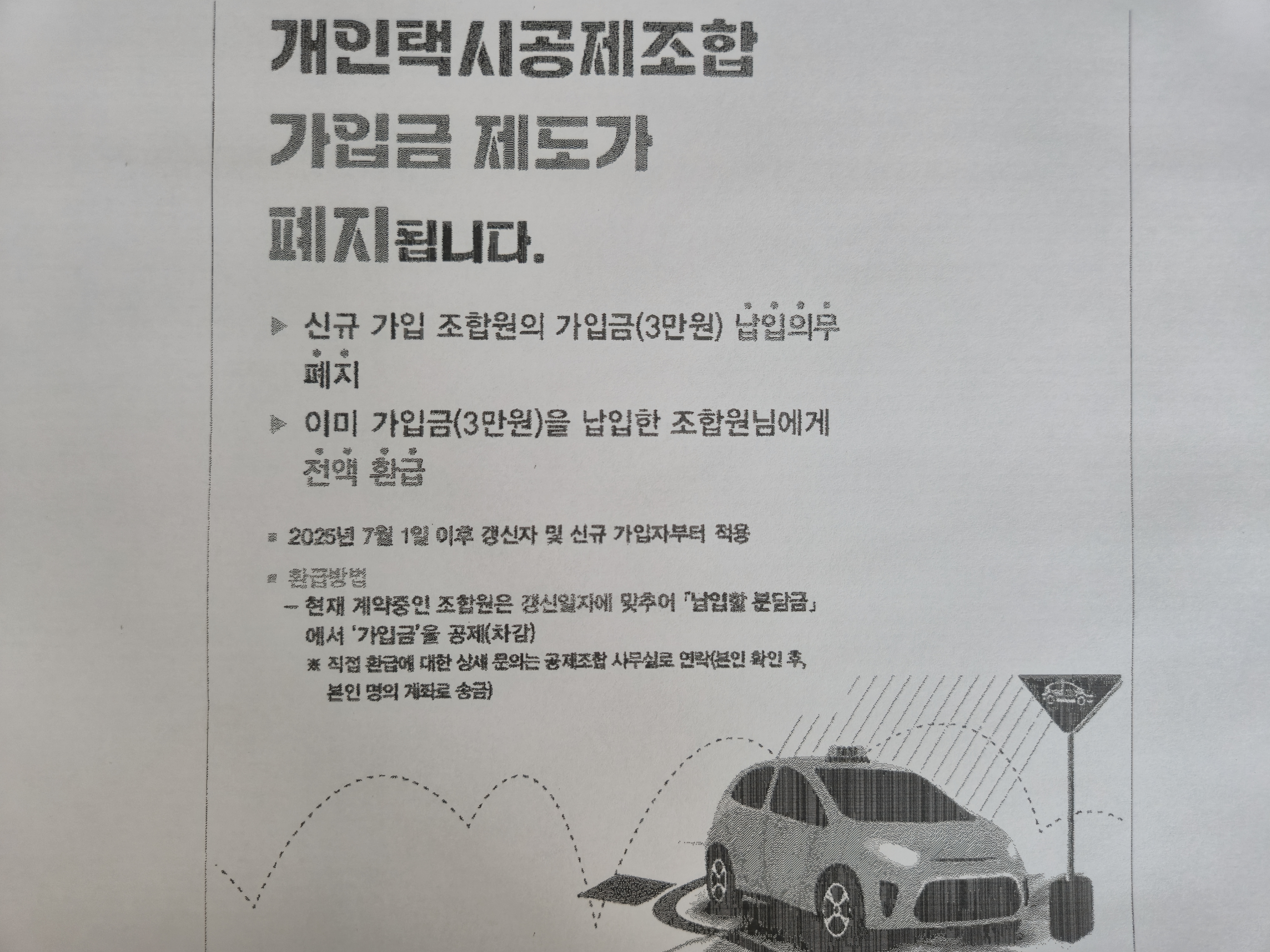 2025년 7월1일부터 개인택시공제조합 가입비가 폐지됩니다(기존가입자는 보험계약시 환불됨)