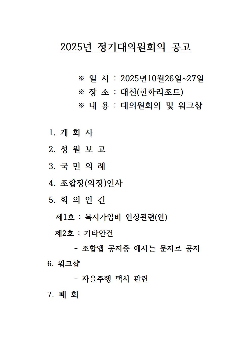 2025년 정기 대의원회의 및 워크샵 공고