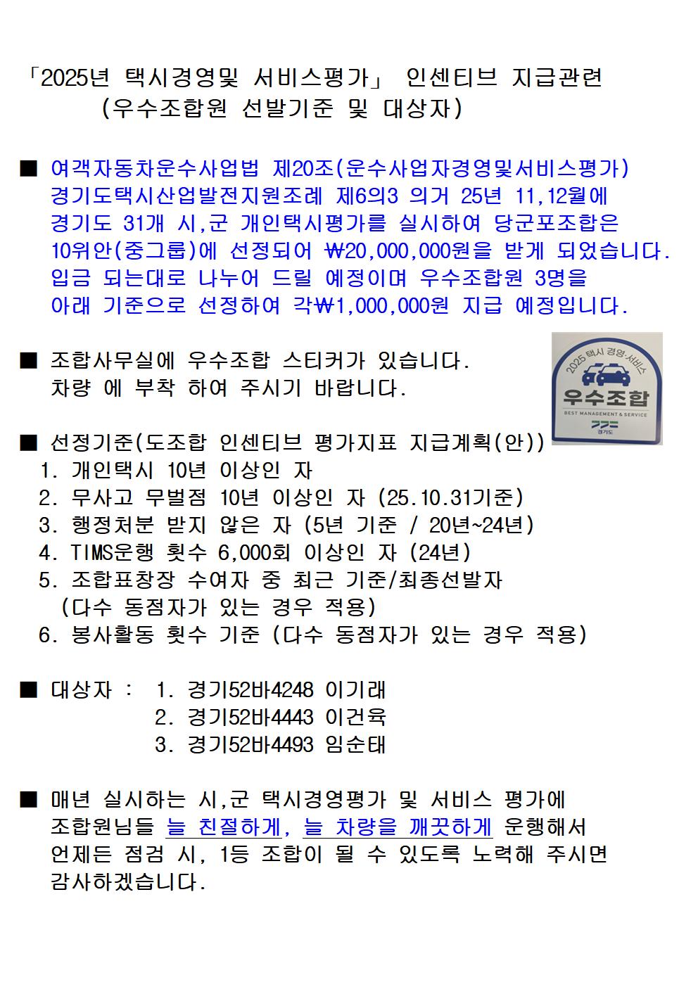 25년 택시경영평가 서비스 평가 -인센티브 지급관련